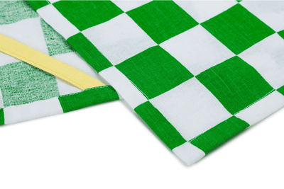 Patterns of interconnected squares form the foundation of the collection, and Arora utilizes a larger format to create Tetris-like blocks on the tea towels and oven mitts, screen printed by hand using AZO-free dyes.