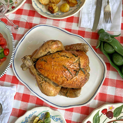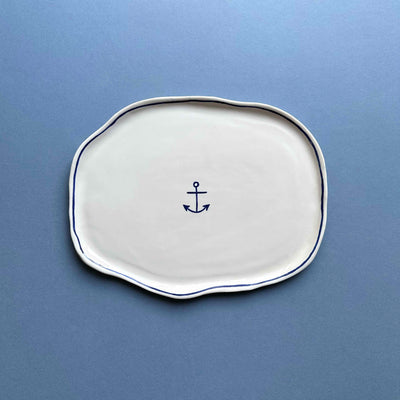 Nautical porcelain serving platter, featuring hand-painted cobalt anchors and a stripe edge.