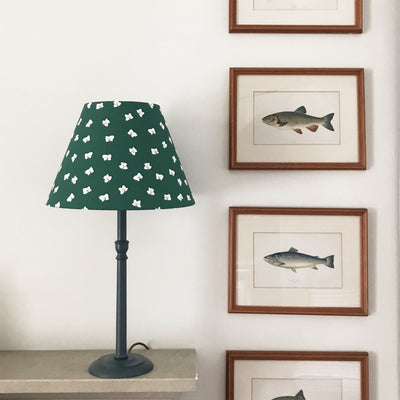 This Empire paper shade is made of finest Belgium wallpaper with a fire-resistant lining inside. It Is completely handmade in England and the edges have a hand rolled finish. The  shade is compatible with BC (UK) and ES (EU/USA) bulb holders. This lampshade is made of Upton Noble's wallpaper called All Year Hellebores HUNTER and pictures hand drawn Hellebores on a dark green coloured background. The colourway HUNTER is inspired by a classic car, which has the infamous “racing green” colour.