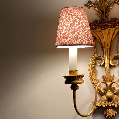 This little Empire paper shade is made of finest Belgium wallpaper with a fire-resistant lining inside. It Is completely handmade in England and the edges have a hand rolled finish. The candle clip works perfectly for wall lights or smaller table lamps. A candle bulb works best for this shade.