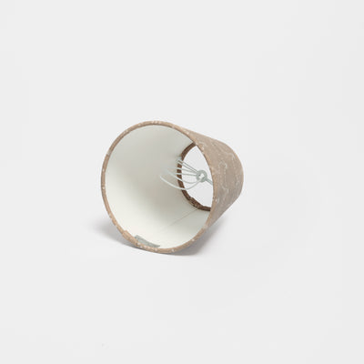 This little Empire paper shade is made of finest Belgium wallpaper with a fire-resistant lining inside. It Is completely handmade in England and the edges have a hand rolled finish. The candle clip works perfectly for wall lights or smaller table lamps. A candle bulb works best for this shade. This lampshade is made of Upton Noble's wallpaper Pearl Chain MARRONE. Faded, nuanced tones lend the wallpaper a beautifully aged, lived-in feel — like a treasured heirloom passed down through generations.