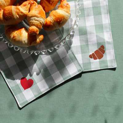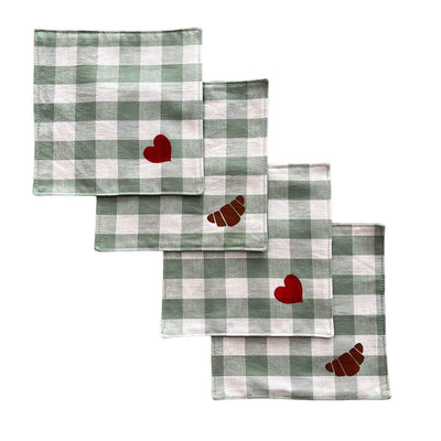 The croissant napkins come in a set of four and are adorned with silk printed hearts and croissants.