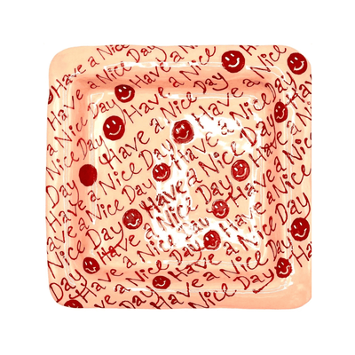 The Have a Nice Day Trinket Tray is a signature style for L&Clay Ceramics. A pink square ceramic tray for your keys, jewellery and trinkets, featuring repetitive text in red that reads "Have a nice day”. Stoneware Clay with Slip and Glaze.