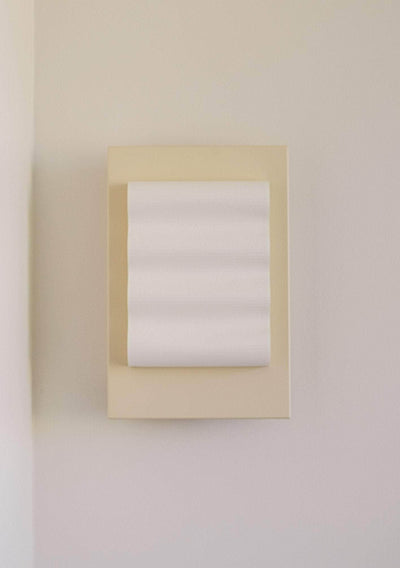 The Frame wall lights feature a simple yet sculptural design, showcasing a harmonious blend of materials: off-white laquered steel paired with paper. The paper emits a soft, warm glow of light, creating an inviting ambiance.