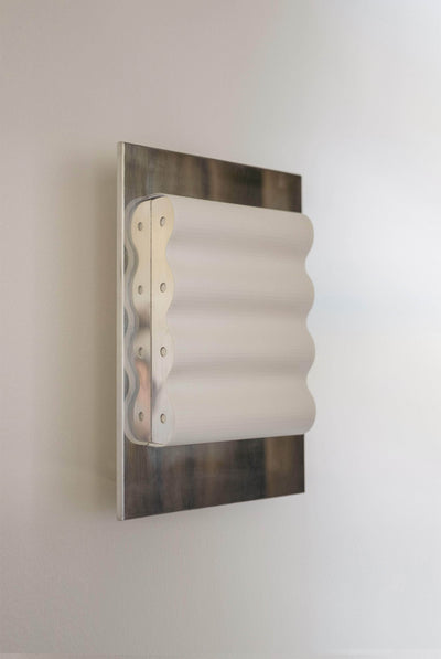 The Frame wall lights feature a simple yet sculptural design, showcasing a harmonious blend of materials: polished stainless steel paired with paper. The paper emits a soft, warm glow of light, creating an inviting ambiance.