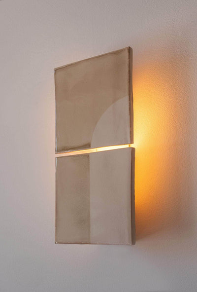 Introducing Violaine d'Harcourt Tiles ceramic wall light collection, a harmonious collaboration with Dutch designer Marianne Smink. Crafted with care in a workshop nestled north of Coimbra (Portugal) each piece in this collection boasts two hand-made tiles, screen-printed in a palette of natural hues. The subtle elegance of indirect lighting provided by a 100Lm 3000k Led bulb ensures a soft, inviting ambiance, casting a gentle, warm glow that enhances any space. As each tile is meticulously crafted by hand, every wall lamp in this collection is unique, showcasing variations in color and the endearing imperfections that define the charm of handmade artistry. This collection of 2-tiles lamps is composed of 3 series : Tiles Moon, Tiles Door and Tiles Line. Each series is available in 6 colors.
