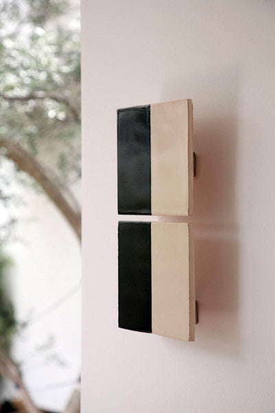 Introducing Violaine d'Harcourt Tiles ceramic wall light collection, a harmonious collaboration with Dutch designer Marianne Smink. Crafted with care in a workshop nestled north of Coimbra (Portugal) each piece in this collection boasts two hand-made tiles, screen-printed in a palette of natural hues. The subtle elegance of indirect lighting provided by a 100Lm 3000k Led bulb ensures a soft, inviting ambiance, casting a gentle, warm glow that enhances any space. As each tile is meticulously crafted by hand, every wall lamp in this collection is unique, showcasing variations in color and the endearing imperfections that define the charm of handmade artistry. This collection of 2-tiles lamps is composed of 3 series : Tiles Moon, Tiles Door and Tiles Line. Each series is available in 6 colors.