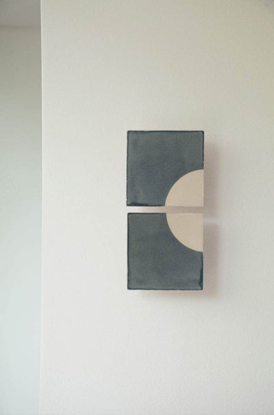 Introducing Violaine d'Harcourt Tiles ceramic wall light collection, a harmonious collaboration with Dutch designer Marianne Smink. Crafted with care in a workshop nestled north of Coimbra (Portugal) each piece in this collection boasts two hand-made tiles, screen-printed in a palette of natural hues. The subtle elegance of indirect lighting provided by a 100Lm 3000k Led bulb ensures a soft, inviting ambiance, casting a gentle, warm glow that enhances any space. As each tile is meticulously crafted by hand, every wall lamp in this collection is unique, showcasing variations in color and the endearing imperfections that define the charm of handmade artistry. This collection of 2-tiles lamps is composed of 3 series : Tiles Moon, Tiles Door and Tiles Line. Each series is available in 6 colors.