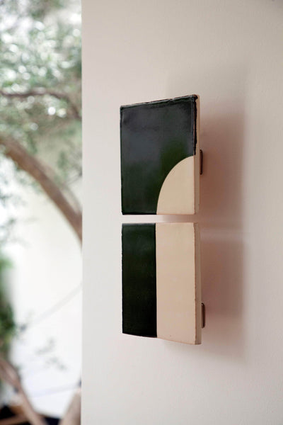 Introducing Violaine d'Harcourt Tiles ceramic wall light collection, a harmonious collaboration with Dutch designer Marianne Smink. Crafted with care in a workshop nestled north of Coimbra (Portugal) each piece in this collection boasts two hand-made tiles, screen-printed in a palette of natural hues. The subtle elegance of indirect lighting provided by a 100Lm 3000k Led bulb ensures a soft, inviting ambiance, casting a gentle, warm glow that enhances any space. As each tile is meticulously crafted by hand, every wall lamp in this collection is unique, showcasing variations in color and the endearing imperfections that define the charm of handmade artistry. This collection of 2-tiles lamps is composed of 3 series : Tiles Moon, Tiles Door and Tiles Line. Each series is available in 6 colors.