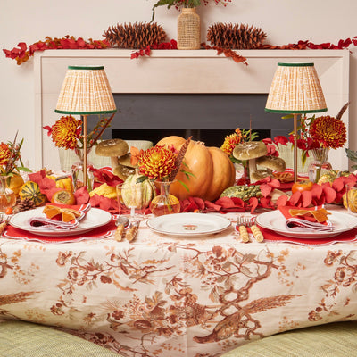Inspired by the beauty of the fall season, this tablecloth showcases elegant pheasant motifs set against a backdrop of earthy tones. Perfect for cosy gatherings or festive dinners, it adds a touch of seasonal charm and sophistication to any dining space.