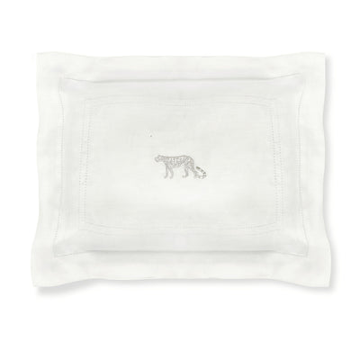Volga’s boudoir pillow with classic Hemstitch in Ivory White and unique Leopard embroidery.