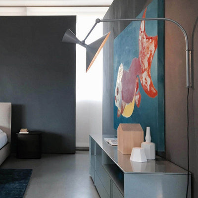 Designed by Le Corbusier for the Unité d’Habitation of Marseille in 1949/1952, it is an adjustable wall lamp with two joints on the arm and a rotating wall fixing. Spun aluminium diffuser. Available with matt grey or whitewash body, with white internal diffusers. Direct and indirect lighting output. Double switch on the cable, for a functional and adjustable light output.