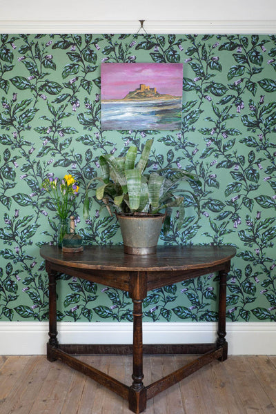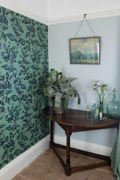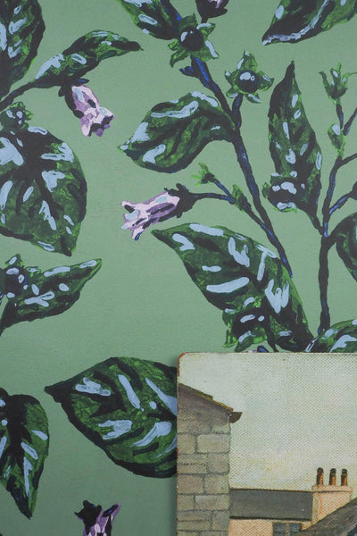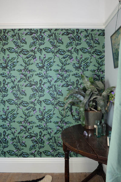 Also known as Deadly Nightshade, this botanical motif will introduce bold pattern inspired by one of Mother Nature’s infamous toxins. This snaking flora design was hand painted to create an delicate organic look, adding a depth and hand finished quality to the wallpaper. This green colour palette helps to bring the outside in, perfect for the bedroom, a cosy living room or a bold kitchen refresh.