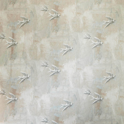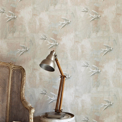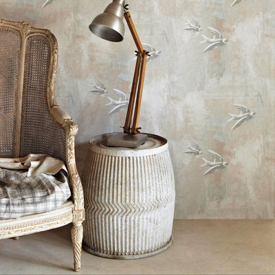 A modern take on the ancient art of fresco painting. The beaten up plaster wall complete with paint marks, old nails and graffiti-style scratches (such as 1963 etched into the brickwork) is softened by decaying grey swallows flitting across the paper.