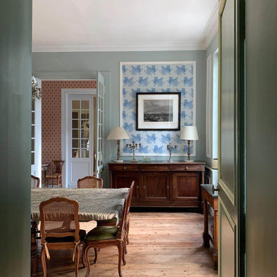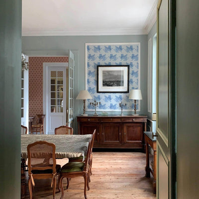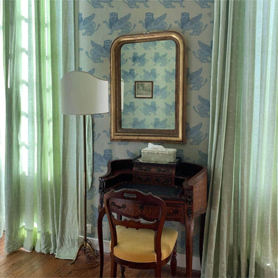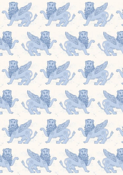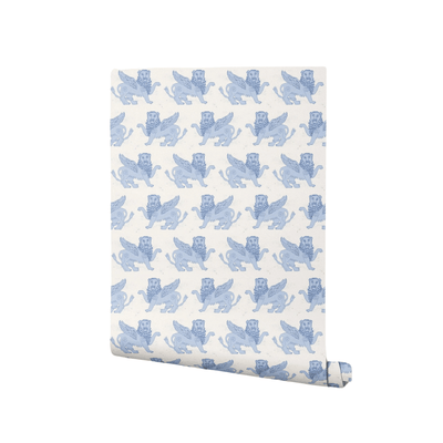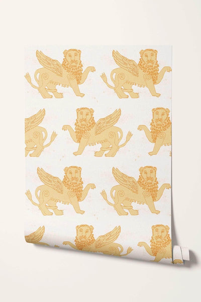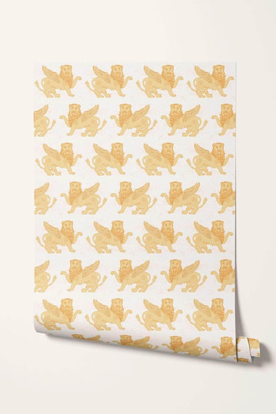 Stood guarding my studio are two winged lion statues, the proud protectors of my studio space. The mythical creature dates back to ancient times and is a powerful symbol, used to give an immediate and unique sign of identity, strength and wisdom. I designed the wallpaper to bring this same feeling of protection into any space, whether that’s a playful children’s room or a grand living space. The design also brings a softness to this mythical being, showcased in a palette of two subtle pastel colourways.