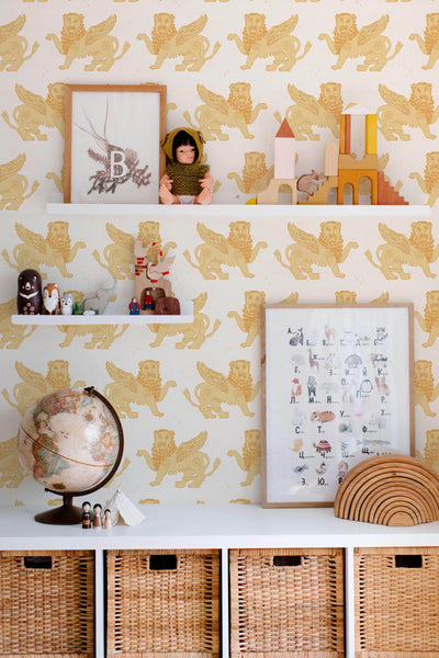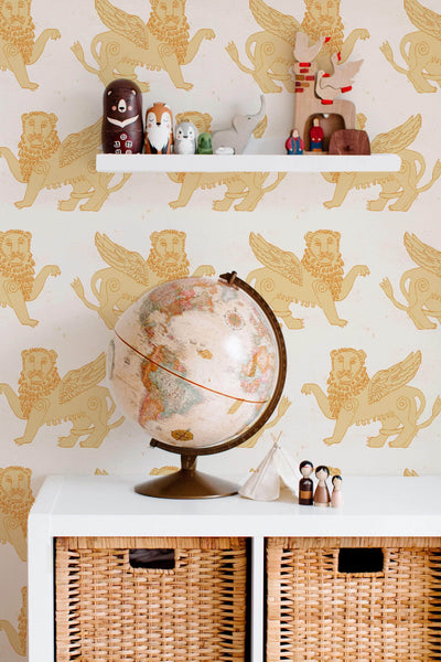 Introduce a touch of mythical elegance to your interiors with our "Winged Lion" wallpaper, where the majestic lions of ancient lore take flight across your walls. Drawing inspiration from age-old mythology, this design encapsulates both wisdom and curiosity, captivating both children and adults alike with its enchanting narrative.