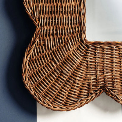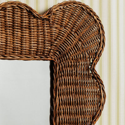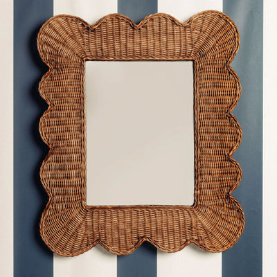 The Mimi Scalloped Mirror is available in two sizes and colors. The scallops are handwoven with sustainable rattan and cane. There are brass hooks at the back for hanging.