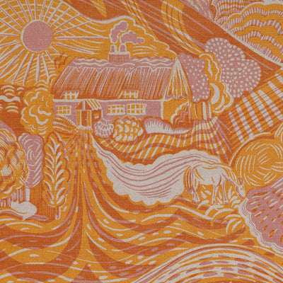 ‘The Plough’ is an abstract take on Beki’s Grandad’s thatched Suffolk farmhouse. Set in rolling fields amongst a beautiful, timeless landscape, complete with fields of wheat and farm horses, this fabric transcends seasons, depicting Beki’s collective memories of this rural landscape.