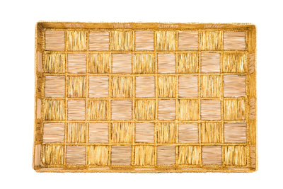 The Damero Large Rectangular Tray is woven with sustainably sourced Iraca palm leaf and dipped in 24k gold. Its checkered motif highlights the contrasting texture and color of natural and gold-dipped Iraca threads. Magnetic Midnight have been perfecting this technique over the past 6 years with our master goldsmith partners in Bogotá: it requires 27 distinct steps over 3 weeks to complete.