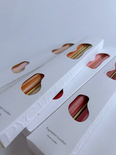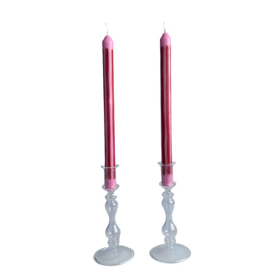 Pair of two dinner candles, hand-poured into loose stripes of red and parlour pink vegetable wax.