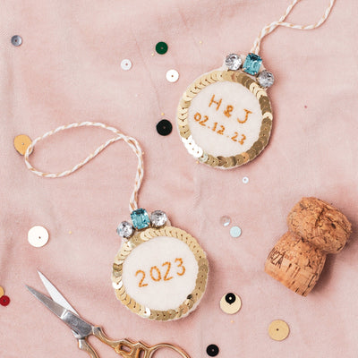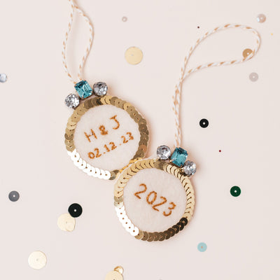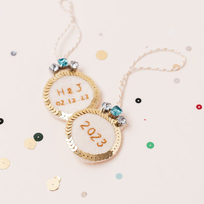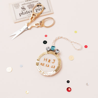 Celebrating an engagement or wedding? Want to send an extra special gift to the new happy couple? This hand embroidered sequin ring ornament is the perfect keepsake.