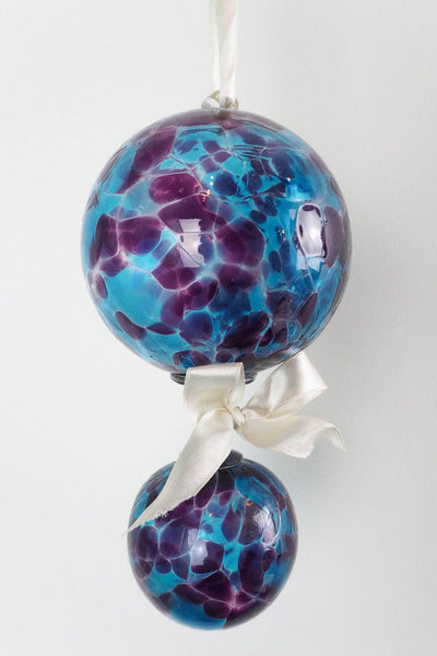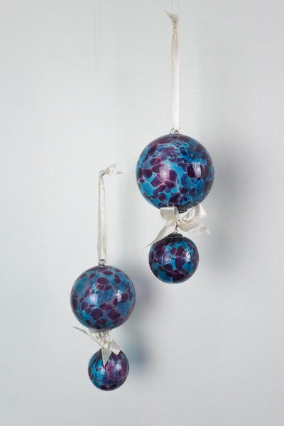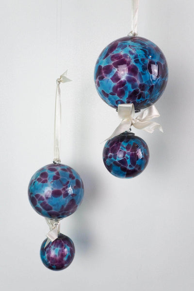 These delightful baubles are crafted from hand blown glass in blue and purple tones. Each hand blown glass bauble is completely unique. The glass shimmers beautifully under a string of lights.