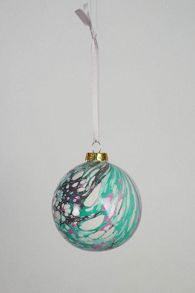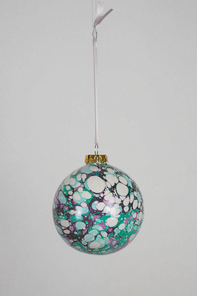 These delightful baubles are hand marbled in Lincolnshire making each one completely unique. This delightfully vibrant Christmas bauble will add colour to any tree. And in shades synonymous with the poisonous arsenic wallpapers of the 19th century, this palette embodies the decadent Christmas décor of the Victorian era. Also a sparkly snow white pigment softens the turquoise and royal purple. These colours will fit effortlessly among your prized decorations and add a subtle swirl of pattern.