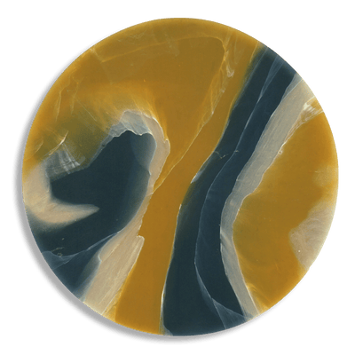 Translucent deep blue and rich ochre, marbled with sandy hues. Wispy white veins reveal the movement beneath the surface.