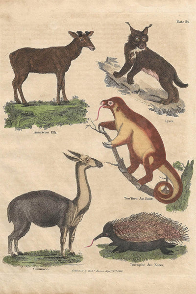 Print No.34 : American Elk, Lynx, Two Toed Ant Eater, Guanaco, Porcupine Ant Eater