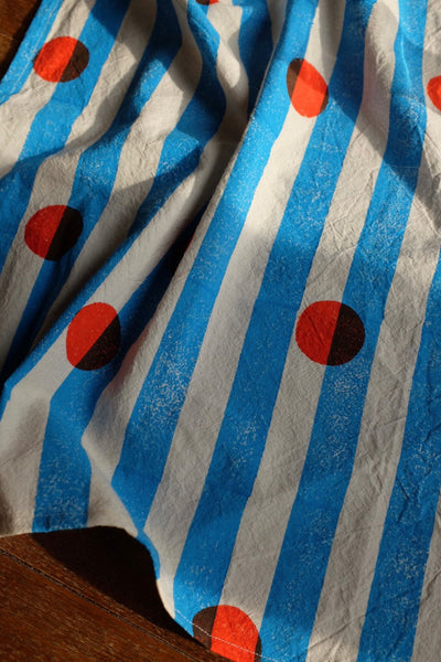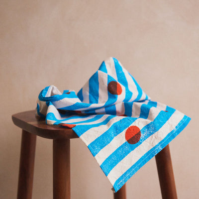 Blue Stripes with Red dots. Set of 4 x Napkins. Block printed in Nic’s London studio. Hand printed in London on 100% softened linen.