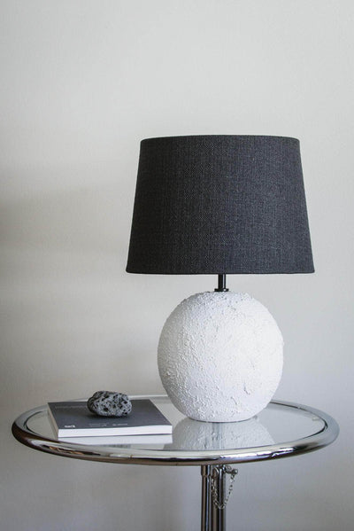 Clay table lamp with a linen effect lampshade. Black textile electric cord, white hand switch, and golden black supports. E27 bulb not included.  Overall Dimensions: 30 x 30 x 43 cm Base Dimension: 20 cm ø 20 Base Color: Textured White Lampshade Dimensions: 30 ø x 30 Lampshade Color: black Designed by Koza.  Koza products are handmade; therefore they may exhibit slight differences in size, shape and finish.  Koza atelier keeps alive the tradition of handcrafted Portuguese pottery, combined with lightning pieces that have a simple design with organic lines. All pieces are made in Portugal, by family-owned businesses.