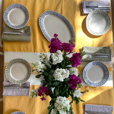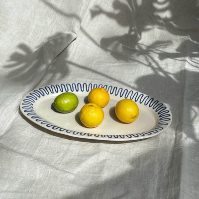 A large serving platter with a hand-painted wiggle. Pile it high with roast potatoes, summer salads or citrus fruits. Versatility is its middle name.