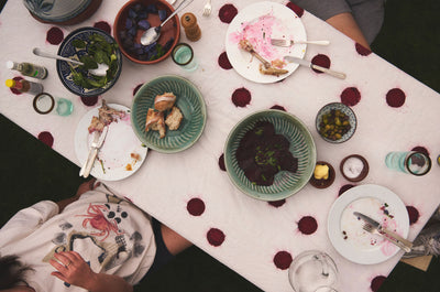When no amount of sunscreen will help and you fall asleep under a sarong, under an umbrella. That is the afternoon sun. Afternoon sun tablecloth hand printed and painted in London on 100% softened linen. Block printed in Nic’s London studio.