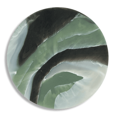 Segments of sage, ivory, and dark grey are defined by striking white veins. The translucency of the plastic allows you to see deep into the material, while the white layers reveal how the plastic flowed when it was melted.