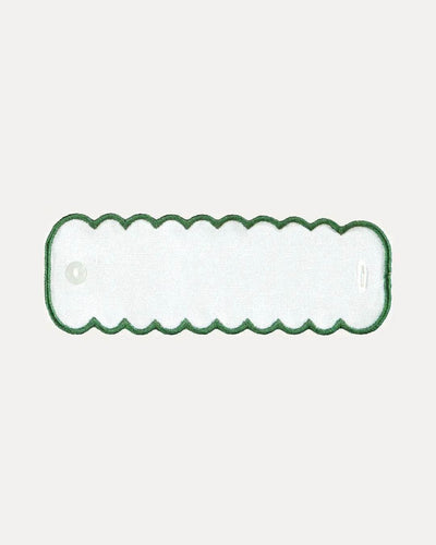 Add a special touch to your table with our personalized white linen napkin ring. Featuring scalloped edges and an elegant green trim, this ring is the perfect complement to any table setting.