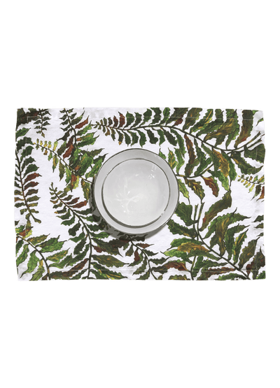 These founding prints are an elegant ‘Fern’; the vibrant ‘Wild Rose’; and the delicate ‘Yellow Rose’, printed on tablecloths, placemats and napkins.
