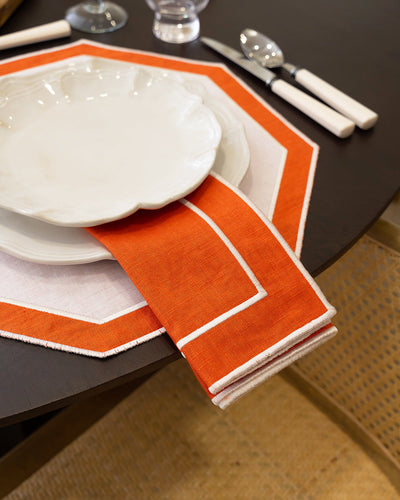 Complete your table with the Douro Napkin, Orange with White , designed to match perfectly with the Douro Individual . Made from linen and cotton , it is the ideal choice for those who value sophisticated details and a contemporary touch at the table.