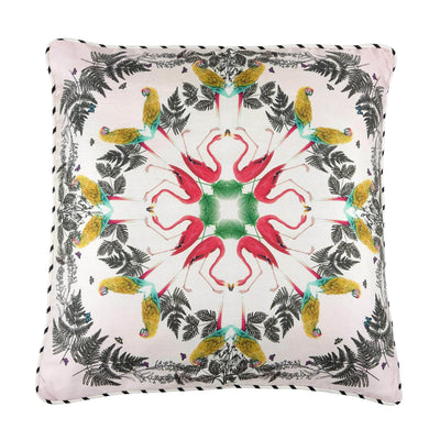Bring tropicana style to your home with the Paradise cushion. Made from silk twill and cotton viscose velvet, the cushion features a ring of black and white exotic foliage around a circular pattern of flamingos and parrots on a white backdrop. The Paradise cushion is perfect as a stand-out accessory in your living room. Can be used as floor cushion or oversized cushion.