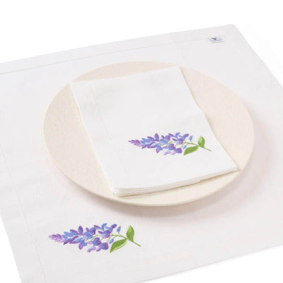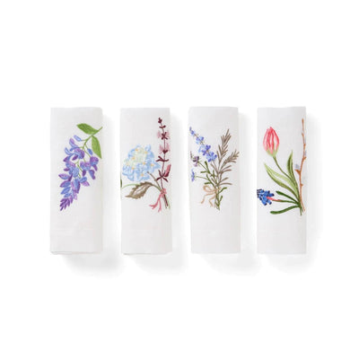Say hello to Von Norten's summer collection with the most dreamy embroidered summer flowers. This stunning gift set includes four napkins with different embroideries: Hydrangea, Lavender, Tulip, and Wisteria. It's the perfect gift box for anyone who loves table settings and interior design, whether for Mother's Day, midsummer, or weddings. Each napkin is consciously handmade and embroidered in white premium Italian linen, featuring elegant stitching on the border. With generous sizing, they're perfect for adding an elegant touch to your summer table.