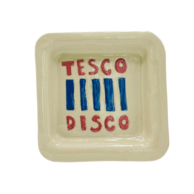 The Tesco Disco Trinket Tray is a signature style for L&Clay Ceramics. A cream square ceramic tray for your keys, jewellery and trinkets, featuring text in red that reads "Tesco Disco". Each piece is handmade and will differ slightly from the image, remaining unique and beautifully wobbly.