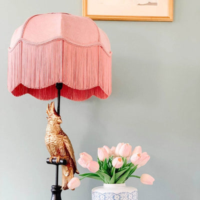 Dusty-pink velvet lampshade with matching fringe.