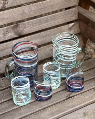 Dive into the Mediterranean with the Cala Collection. Handblown tumbler glasses and matching jugs, all individually created with recycled glass by skilled artisan glass blowers on the Balearic Island of Mallorca. Each piece is unique, enchanting and a beautiful piece of art.