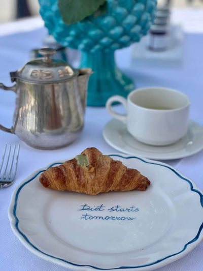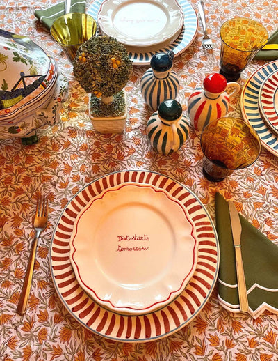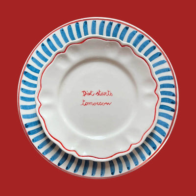 Hand painted by local artisans in Italy, these beautiful 100% ceramic dining plates, work perfectly with a fun tablescape.Bring colour and happiness to your table with this capsule tableware collection designed by Sveva's s Home. Enjoy mixing and matching Sveva's scalloped plates! Each set includes: 4 ceramic plates with "Diet Starts Tomorrow" written on them.