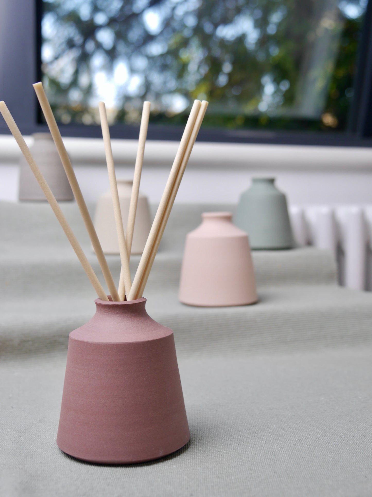 We use stains to colour the clay before throwing with it on the wheel, meaning that the reed diffuser is pigmented throughout.