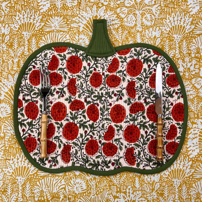Add a touch of autumn charm to your table with Table Love's handcrafted pumpkin-shaped placemat. Made in Rajasthan from traditional hand-block-printed fabrics and vibrant Ikat designs, this unique piece is perfect for Halloween, Thanksgiving, or cozy fall dinners.