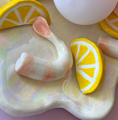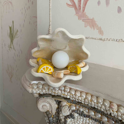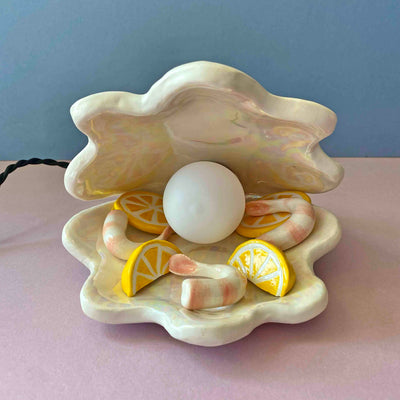 Handmade seafood clam shell lamp. Off-white ceramic clam shell with mother of pearl interior, nestling prawns and lemons. A result of Minnie-Mae's healthy obsession with shells and all things sea.