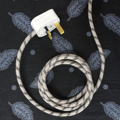 After painting they receive a protective semi-matt varnish and are fitted with a brass switched bayonet cap lampholder and a classic linen-covered stripey cream & black flex.
