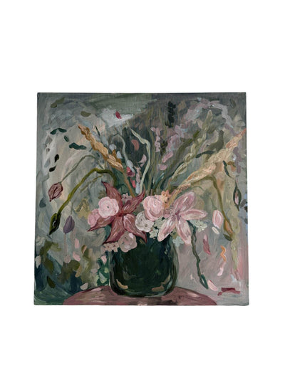This piece was painting from random flowers sitting in her art studio. The muted and pastel colours bring a lot of peace to a room, and she hopes that this is mirrored for the viewer as well.