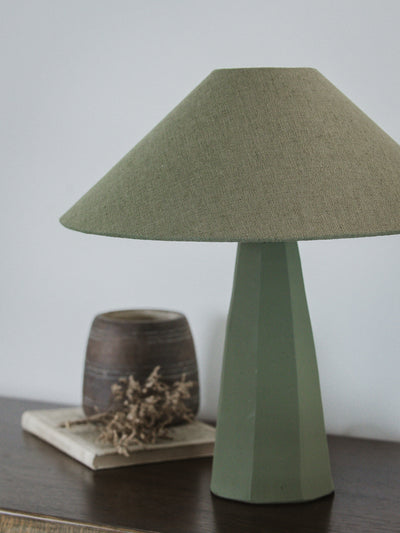 Handcrafted clay table lamp with a linen effect lampshade. Black textile electric cord, black hand switch, and black supports. E27 bulb not included.