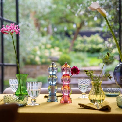 The Blue Icy Bobbin Salt and Pepper Mill combines striking design with practicality. Crafted from durable acrylic with a transparent design that allows you to see the salt or pepper inside the grinder. Addison Ross's signature Bobbin shape adds a touch of elegance to your table. Standing 24cm tall, this mill is both a functional kitchen tool and a stylish tabletop centrepiece, perfect for everyday use and special occasions.